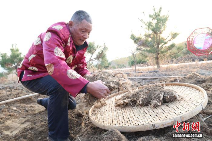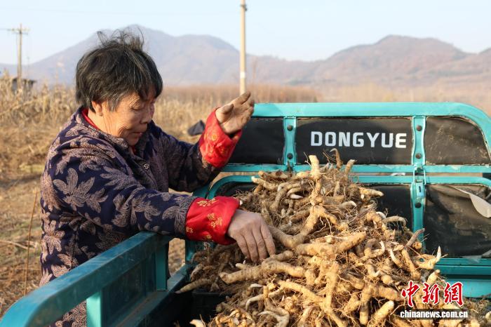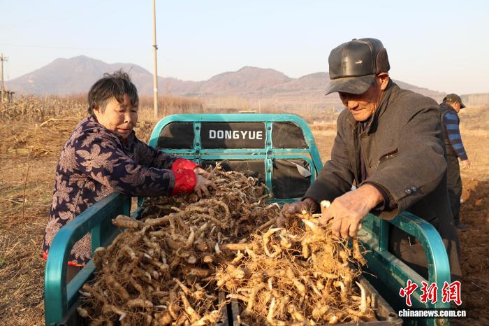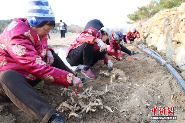 11月26日,山东省泰安市岱岳区天仄街讲耿庄村,村平易近们正在田间劳碌采支泰山黄粗,1株株充分的黄粗破土而出。周艺伟 摄